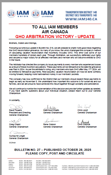 TO ALL IAM MEMBERS AIR CANADA GHO ARBITRATION VICTORY – UPDATE