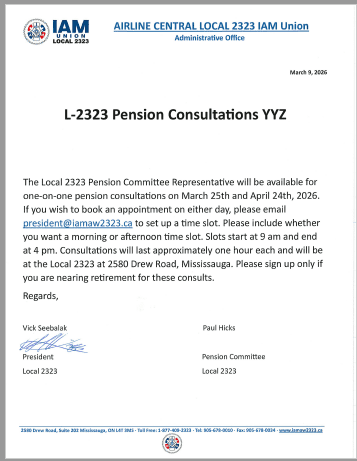 president@iamaw2323.ca to set up a time slot. Please include whether you want  a  morning or  afternoon  time slot. Slots  start  at 9 am and  end at 4 pm. Consultations will last  approximately  one hour  each and will be  at the Local 2323 at 2580 Drew Road, Mississauga. Please sign up only if you are nearing retirement for these consults.