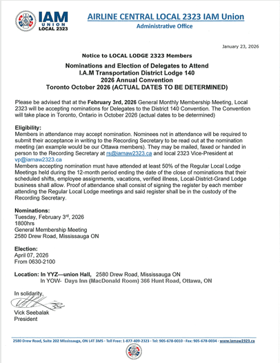 Please be advised that at the February 3rd, 2026 General Monthly Membership Meeting, Local 2323 will be accepting nominations for Delegates to the District 140 Convention. The Convention will take place in Toronto, Ontario in October 2026 (actual dates to be determined)