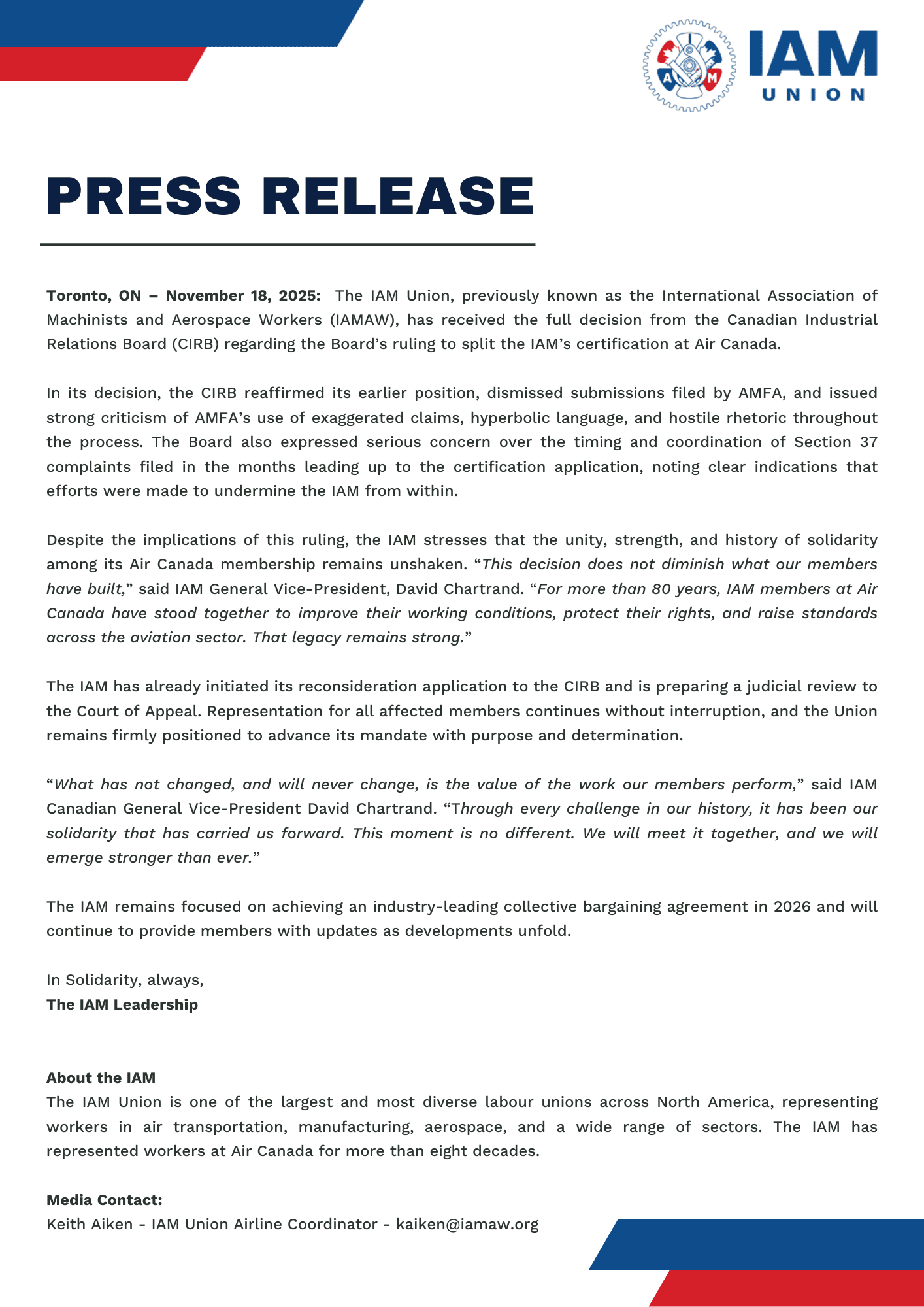 Toronto, ON – November 18, 2025: The IAM Union, previously known as the International Association of Machinists and Aerospace Workers (IAMAW), has received the full decision from the Canadian Industrial Relations Board (CIRB) regarding the Board’s ruling to split the IAM’s certification at Air Canada.