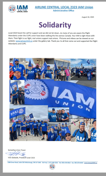 Local 2323 heard the call for support and we did not let down. As many of you are aware the Flight Attendants under the CUPE union have been walking the line across Canada. Your IAM is right there with them. Their fight is our fight, real unions support real unions.  Pictures and videos can be viewed on our website: www.iamaw2323.ca under the gallery tab. Thank you to all that come out and supported the Flight Attendants and CUPE.