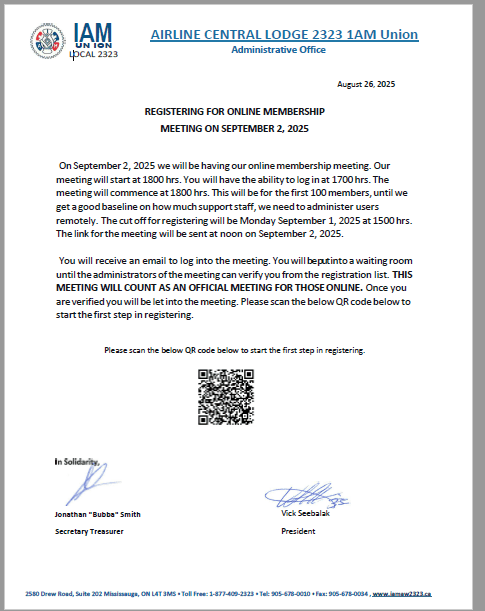 AIRLINE CENTRAL LODGE 2323 I.A.M.A.W. Administrative Office February 27, 2025 IAM Local 2323 Ottawa Members (YOW) Line Station Meeting IAM Local 2323 will be hosting a Membership Meeting […]